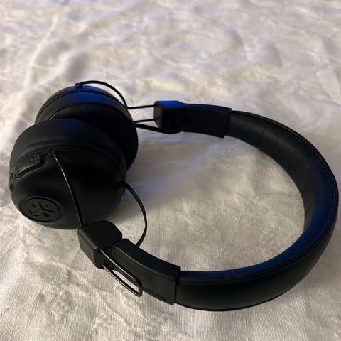 JLab hodetelefoner med on-ear design i svart farge. Hodetelefonene har justerbar hodebøyle og polstrede øreputer. Bluetooth