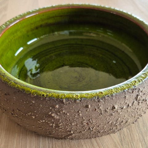 Bollen har en brun og grønn glasur med et dekorativt mønster i midten. Egnet til servering eller dekorasjon.