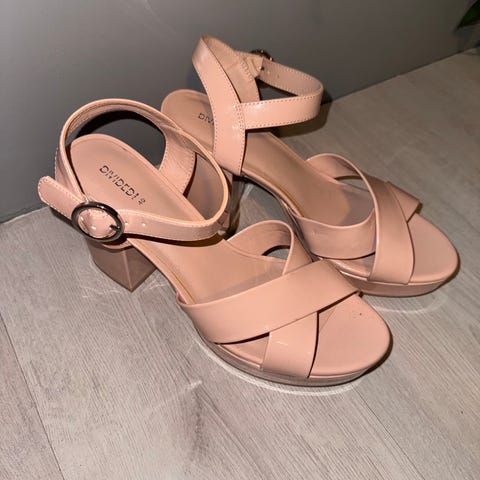 H&M Hæler i størrelse 39 med rosa farge. Skoene har flere tynne stropper og en firkantet tå. Hælene er tykke og gir stabilitet. Egnet for damebruk.