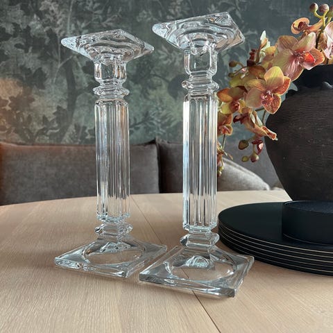 Lengden er 20 cm og bredden er 14 cm.Høyden er 4 cm.Denne lysestaken er brukt bare et par ganger og den er som ny.Den har en spesiell fasong og er ulik de andre Bohemia lysestakene som jeg har sett.Den kan hentes hos meg i Oslo eller jeg kan sende den og kjøper betaler porto.