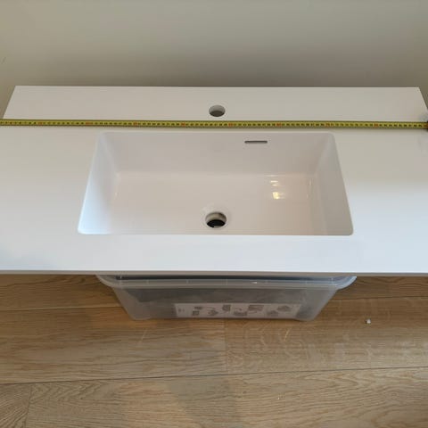 Er i glass og er mørkegrå. Kan se igjennom glasset og ser utrolig fint ut. Denne fungerte dessverre ikke plassmessig på min benkeplate! Ikke brukt og ingen skadet. Mangler røropplegget da det ble montert av rørlegger.