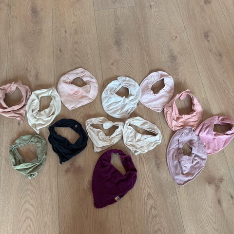 11 stk. Siklesmekker og en større silikonsmekke. En av smekkene er i ull