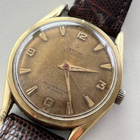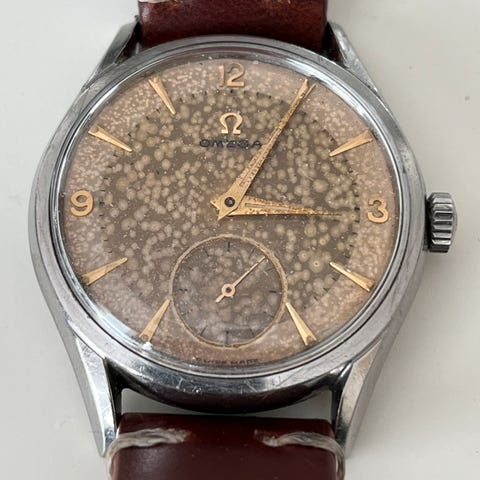 Vintage Omega fra ca. 1950-1959. Klokken trekkes opp og går, men servicehistorikken er ukjent og den må innom service. Fjæret må byttes & kronen også siden den sitter skjevt og er ikke Omega sin. Glasset burde byttes også.