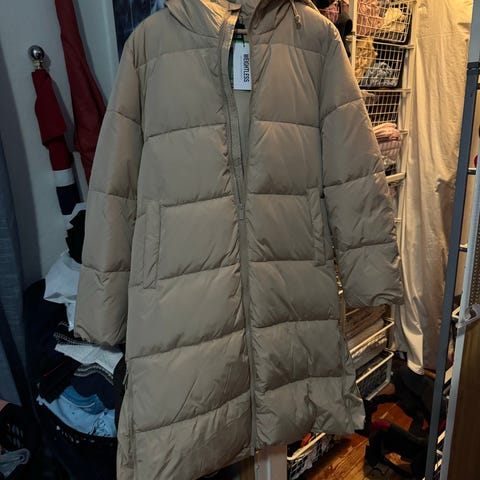Parkasen er ikke brukt, ble bare liggende! Størrelsen er small, men mer som medium! Super å kan brukes hele året! En fleece under på vinteren!