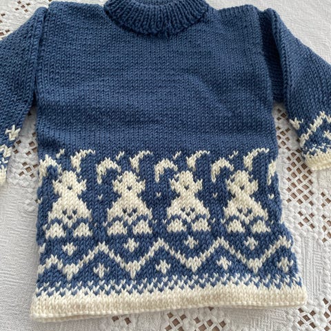 Nydelig strikket genser i lys blå lys grå farge med hvitt mønster. Tipper den er strl. 62-68. Minste min blir tre år i februar og den har blitt for liten for henne. Utrolig flott genser (ikke jeg som har strikket den).
