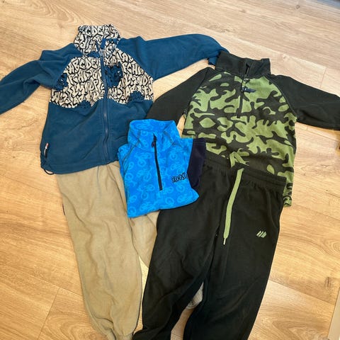 Klespakke med fleece klær, 6 jakker og 3 bukser. Den ene buksen har noen hull - se bilde.