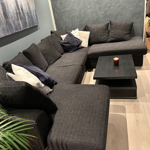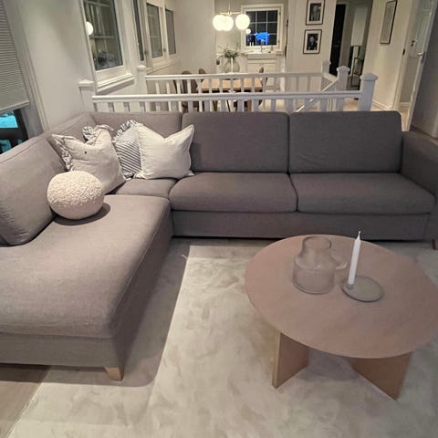 God sofa fra Bohus, lys beige, selges rimelig pga noen få merker etter en valp som var på besøk (se bilde). Alle trekk kan taes av og vaskes, det ble gjort til jul i fjor. Alle puter kan snus unntatt sjeselongputen. Merkene etter valpen er på sjeselongputen og nede på siden av sofaen. (Kan nok fikses så det blir mindre synlig med en beige tråd. ) Lyset/skyggene i rommet gjør at sofaen ser ujevn ut i fargen. Det er den ikke. Sofaen er brukt kun fredag og lørdagskvelder. Ca 10 år gammel. Nypris var 20 000. Pynteputene følger ikke med.