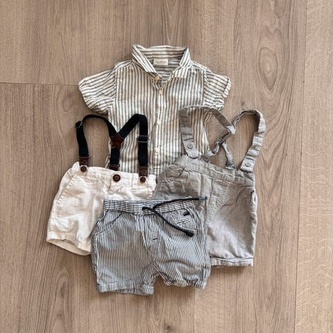 Liten klespakke fra newbie i størrelse 74 selges for 300,- kroner. Klespakken består av en blå shorts, en seleshorts / romper og en kort heldrakt eller pyjamas. Alle klærne fremstår som pent og lite brukt, uten noen form for anmerkning.