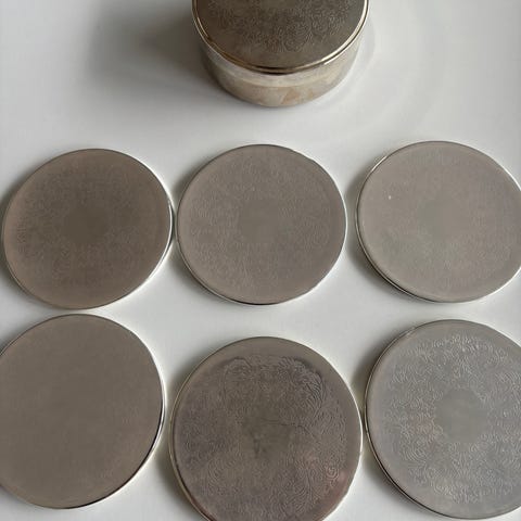 Fem stk.glassbrikker i oliventre, i holder. Både glassbrikkene og holderen er i fin stand. Merket: PKB Herceg novi.