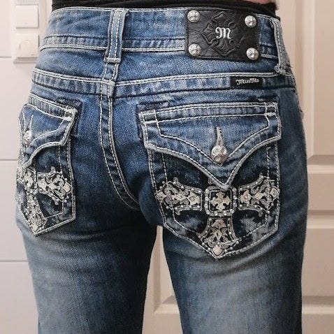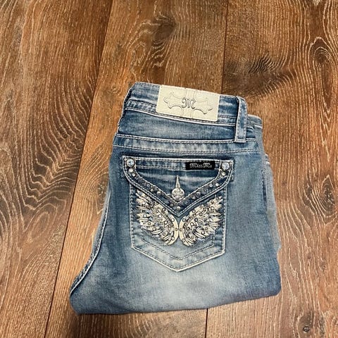 Miss Me JP511759 Skinny Jeans i blå farge. Laget av 98% bomull og 2% elastan for komfort og fleksibilitet. Størrelse W28,. Jeansene har dekorative detaljer på baklommene. Normal slitasje på nederst på begge buksebeinene. Buksen er hel. Buksene passer hvis du bruker 38-40 i størrelse.