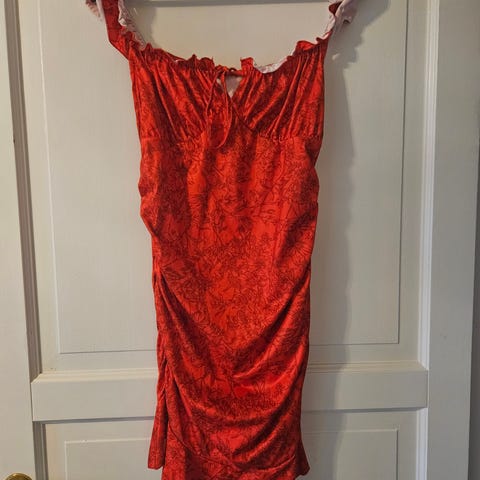 S.g.s ny rød foret kjole m/kappe nederst og knytebelte t.s /brukt kun 1 gang i et bryllup. Selges til spottpris kr 90.