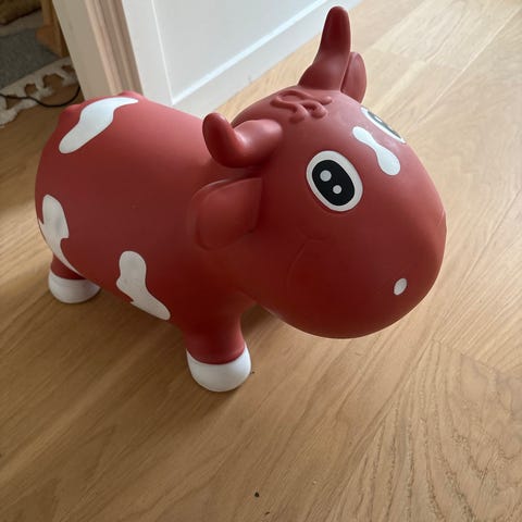 Søt, rustrød oppblåsbar ku i tykk gummi. Dette hoppedyret er en spennende og lærerik leke til smårollinger, hvor barnet sitter på kua og bruker sine egne ben til å hoppe og sprette. Dette er en kreativ og morsom variant av hoppeballen hvor de små også utvikler kjernemuskulatur og koordinasjonsegenskapene, samtidig som de har det hoppende gøy. Kua har myke horn og ører som barnet holder i for å hoppe. Den er trygt testet, og er helt fri for gift og snusk.