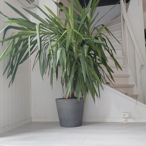 Stor yukka palme, nesten i taket her, så den trenger et sted med høyt under taket. 2 stammer, så den kan deles. Potte følger ikke med.
