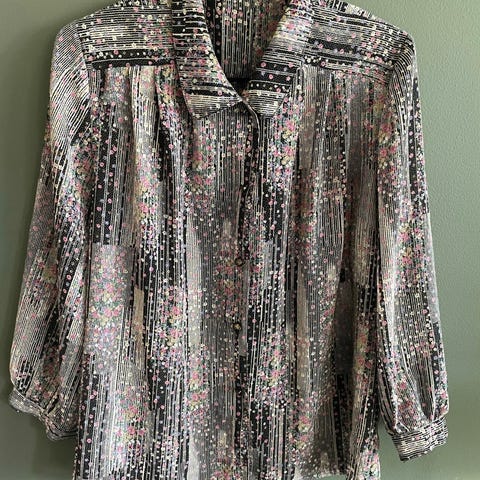 Lett bluse, skjorte med knapper, 3/4 ermer, flerfarget. Polyester, merke: B.Women. (Se gjerne mine andre annonser også)
