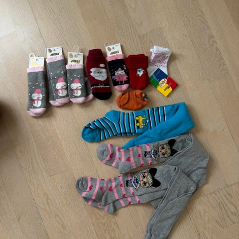 Fine barneskoler i ulike farger til barn fra 2-4 år, selger denne pakken for 60kr😊 noen av sokkene er fra safa, Lindex og name it. De fra safa er i 100% ull