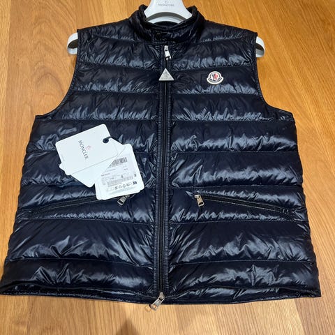 Moncler vest i navy for herre i størrelse 3 (M). Vesten har en polstret design med glidelåslommer foran. Materialet har en blank finish, og plagget har Moncler-logo på brystet. Vesten er egnet som ytterplagg eller mellomlag i kaldt vær.