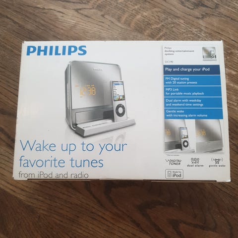 Har du en iPod, kan du sette den opp på toppen av anlegget eller i nærheten som en ladestasjon fra anlegget. Da kan den brukes som en bilderamme, spille av videoer eller høre på musikk via anlegget.