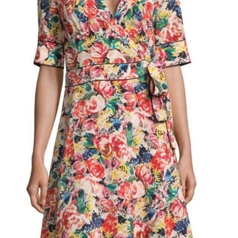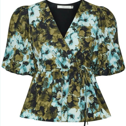 Vero Moda i nydelige,flerfarget blomstermønster. i størrelse L ,Blusen har kort erme med volangdetaljer .Den er laget i lett materiale og har en knyting i siden for justering av passform.