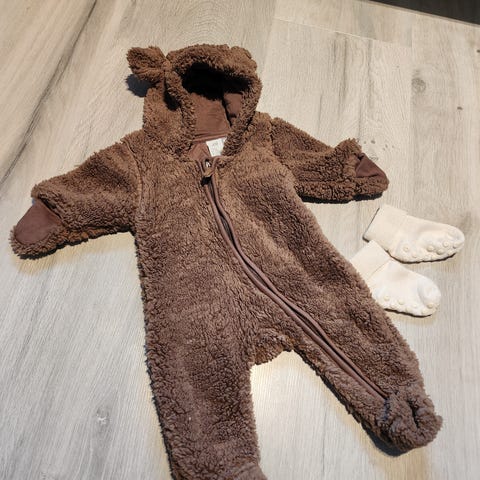 H&M barnedress i størrelse 50, unisex. Dressen er hvit i myk pile. Den har hette med små ører og glidelås foran som går ned til benet for enkel påkledning. Egnet for små barn og kan brukes som ytterplagg eller koseplagg.