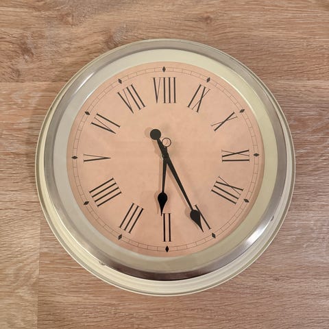 Stilig veggklokke fra IKEA, marineblå og gull.