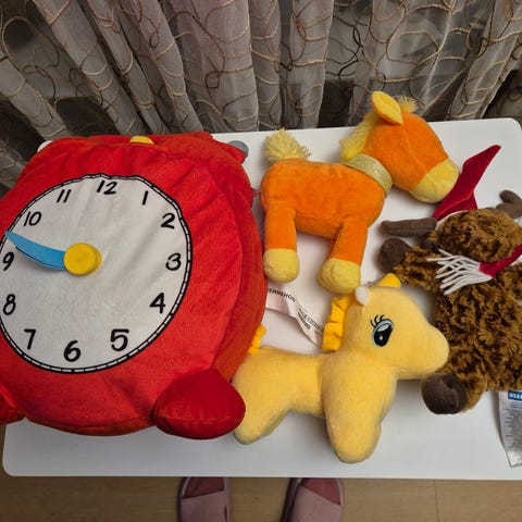 Bamser i ulike størrelser og fasonger. Ulike merker som tinka og kidskids (kid). Liten hund fremdeles med lappen på. Ellers svært lite brukt.