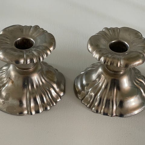 To lysestaker til tynne lys. Laget som små blomster med blader. Tinn fra Perletinn. Diameter: 7,8 cm, høyde: ca. 2 cm. Prisen er for begge lysestakene.