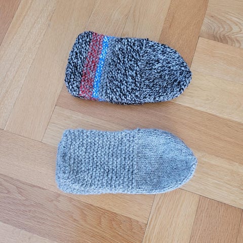 Fine, hjemmestrikkede ulltøfler/ullsokker, ca 22 cm lange. Passer nok derfor best til barn.
