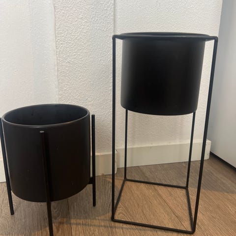 Selger denne fine potten da den ikke blir brukt. Potten er ikke fast i stativet/pidestallen. Potten er av hardplast, stativet er av metall. Håper noen andre kan få glede av den.