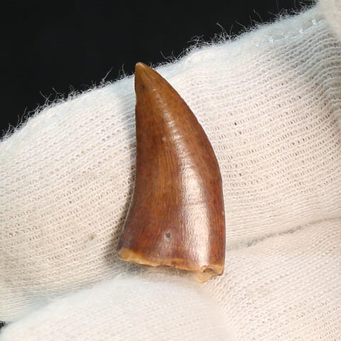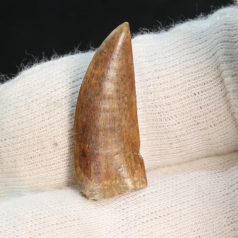 En sjelden og spennende tann fra en liten rovdinosaur i Abelisauridae-familien, funnet i Nord-Afrika (sen krittperiode). Disse tennene er vakkert bevart, med skarpe tagger og karakteristisk buet form.