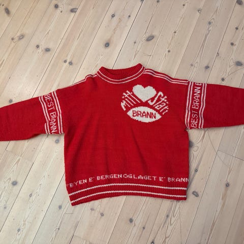 Brann ullsokker i rød farge, strikket materiale. Sokker med oppbrett og Brann-logo i hvitt. Egnet for kalde forhold og som varme tilbehør. Genser i str M .