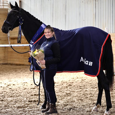 Agria hesteteppe i blå farge med rød kant. Dette er et flece dekken str 155. Brukt 2 ganger i ridehus😊