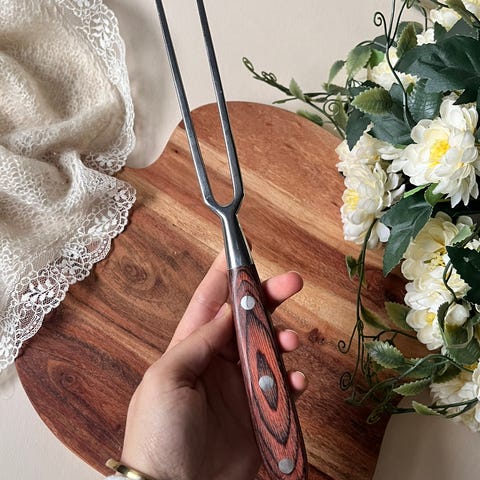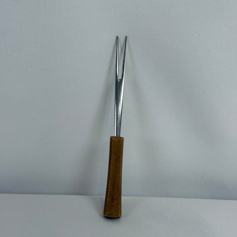 Grillgaffel/tranchergaffel med håndtak i teak. Har bruksslitasje. Lengde: 27,5 cm.