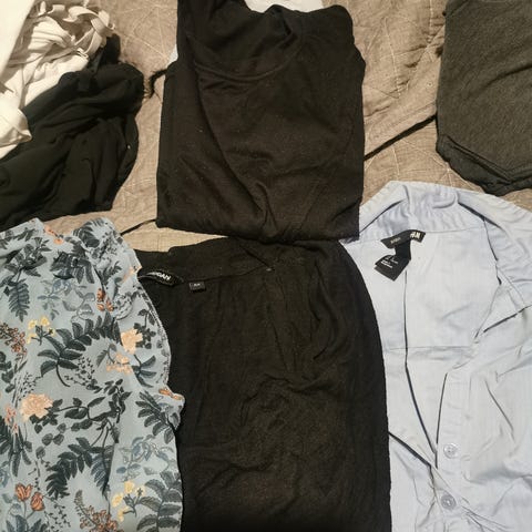 En kjole og diverse bukser, topper, et skjørt (alt du ser på bildene). Jeg er vanligvis en L/XL og det passet meg da jeg var gravid.