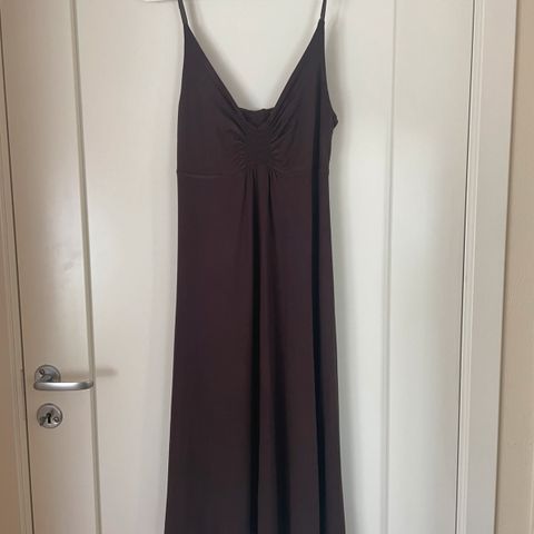 Selger en flott, tøff festkjole i mørkebrun. Skjørtpartiet har en fin volang. Kjolen er foret ned til lårene.