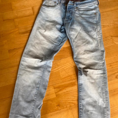 Er noen tydelige bruksmerker, som f.eks. på patchen. Buksen har vært hos skredder en gang når det oppsto en rift mellom beina etter jeg spilte fotball med dem.😅 Riften er helt sydd igjen av profesjonell skredder så ikke noe å tenke over, (se bilde i annonsen).