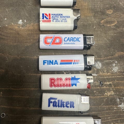 En samling av vintage lightere i ulike størrelser og farger, inkludert hvite og gule lightere med reklame og logoer. Disse lighterne er laget av plast og metall, og passer for samlere eller til bruk som vanlige lightere.