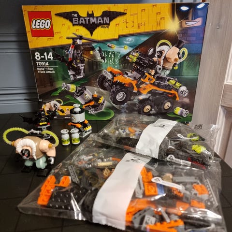 LEGO THE BATMAN MOVIE Bane Toxic Truck Attack Set nr. 70914. Sjelden Batman Lego med Big Fig Bane. Inkl. bruksanvisning og ekstra deler og brickseperator mangler en sticker og en feil-sticker vill si 98-99% fullført. Kan brytes ned i enkelt deler vis kjøper ønsker det.
