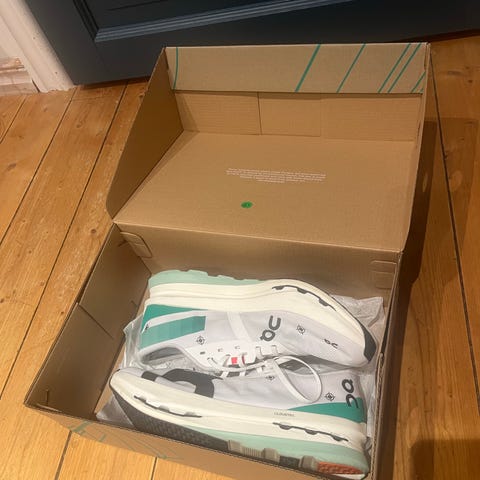 On Running løpesko i størrelse 40, designet for løping. Skoene har en hvit og rosa fargekombinasjon med detaljer i svart og oransje. Materialet er lett og pustende, egnet for løpeaktiviteter. Passer for dame.