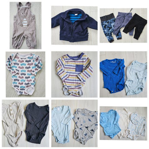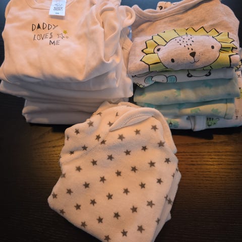 Barneklær for gutt i størrelse 68 pent brukt av 1 gutt. Inkluderer dress med glidelås i grått med røde detaljer fra Levis, samt 3 bodyer (Newbie, Name it og Cubus) og 1 genser (Newbie) i ulike farger og mønstre. 2 bukser fra Newbie og pyjamas fra Lindex.