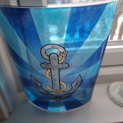 Selger en glassvase med blå fargetoner og dekorativt ankermotiv. Vasen er laget av glass og har en rund form. Egnet for dekorasjon og som blomsterholder.