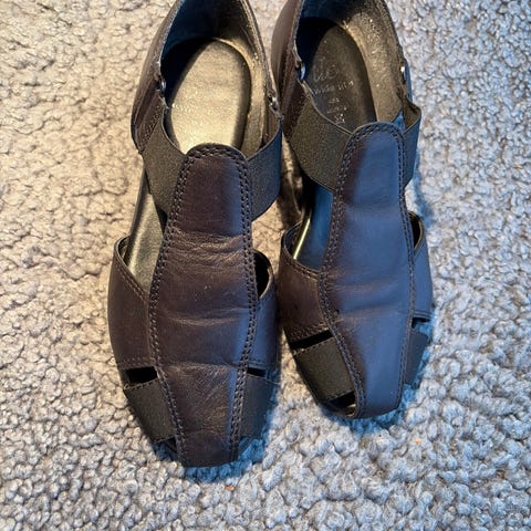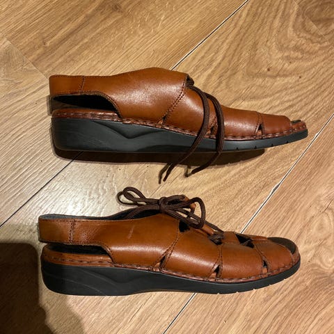 Calvani sandaler i størrelse 36, laget av beige skinn. Åpen tå og justerbar lukking ved hælen. Designet for dame.