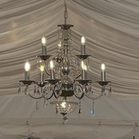 Prismekrone/lysekrone/krystall taklampe, med fint fargespill. Tynne høye pærehylser mangler.