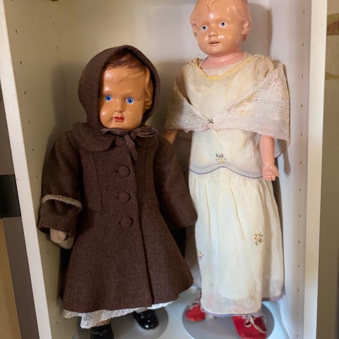 Se godt på bildene, dukkene viser tegn til alder, men de er i god stand syntes jeg. De trenger litt kjærlighet og et godt hjem. Klærne lukter innestengt/loft/gammelt så det trenger nok en god vask.