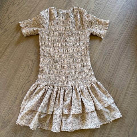"Soft Knit Mini Dress" fra ByTimo. Delikat strikkekjole i offwhite. Kjolen har rund hals, lange ballongermer og puffende skuldre. Soft Knit Mini Dress sitter smalt i overkropp før skjørt skrår ut i a-shape. Markert midje. ( strikk) Perfekt lengde til rett over knærne. Kjolen ble utsolgt med en gang den ble lansert i 2019. Brukt et par ganger. Vurderes solgt siden den brukes for sjeldent. Bilde i i hvit er hentet fra nettet og brun kjole viser detaljene på kjolen bedre.