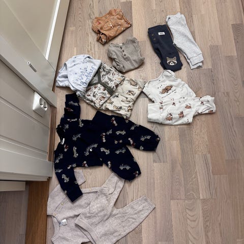 Stor klesveske for babyer fra 0-62. Brukt (lite brukt og noen er fortsatt nye), men fortsatt i god stand som vist på bildene. Flotte merker, god til å vaske. Inneholder diverse plagg som bodyer, bukser, gensere og heldrakter. Laget av diverse materialer som 100 % bomull, egnet for små barn, designet for komfort og mobilitet.