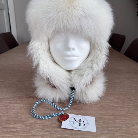 Eksklusiv Pelslue med hvit kunstig pels. Lett og varmtfóret med luftig fiber som brukes i moderne puter og dyner.
