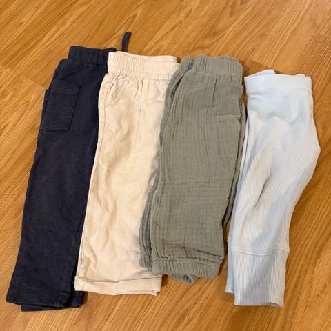 Tre bukser - de to grønne buksene er 62 og 74, men brukt sammen.
