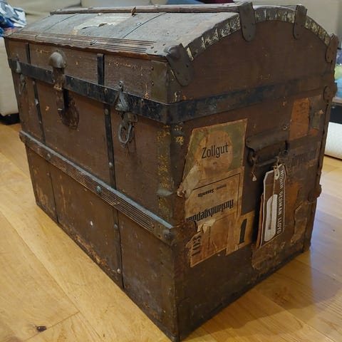 Kisten er laget i heltre furu med beslag og håndtak i smijern, og har en nydelig slitt overflate som vitner om lang brukshistorie. Lokket er buet for å tåle trykk og la vann renne av – et klassisk trekk fra datidens reisekister.