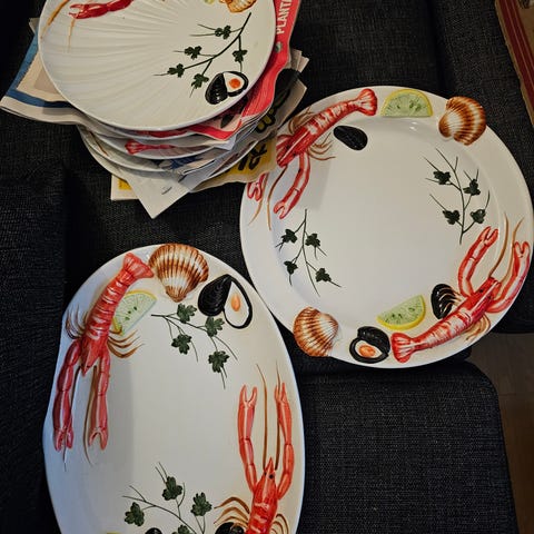 Østerstallerkener dekorert med sjø og skalldyr - Laget rundt 1970