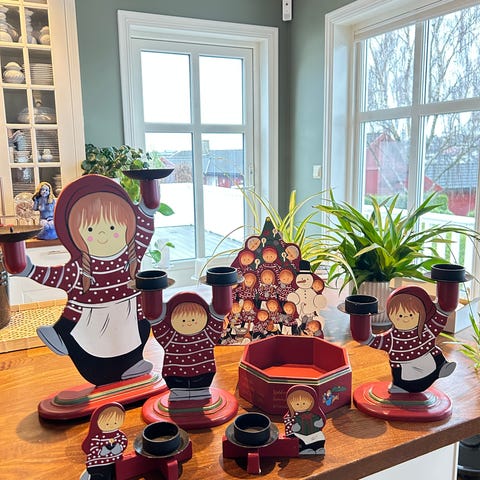 Stofffigur i form av en elg med grå lue, hvitt skjerf, stripete armer og ben, samt brune horn. Figuren har en myk, plysjaktig kropp og står på mørke grå sko. Passer som dekorasjon, spesielt i julen.Høyden 55cm
